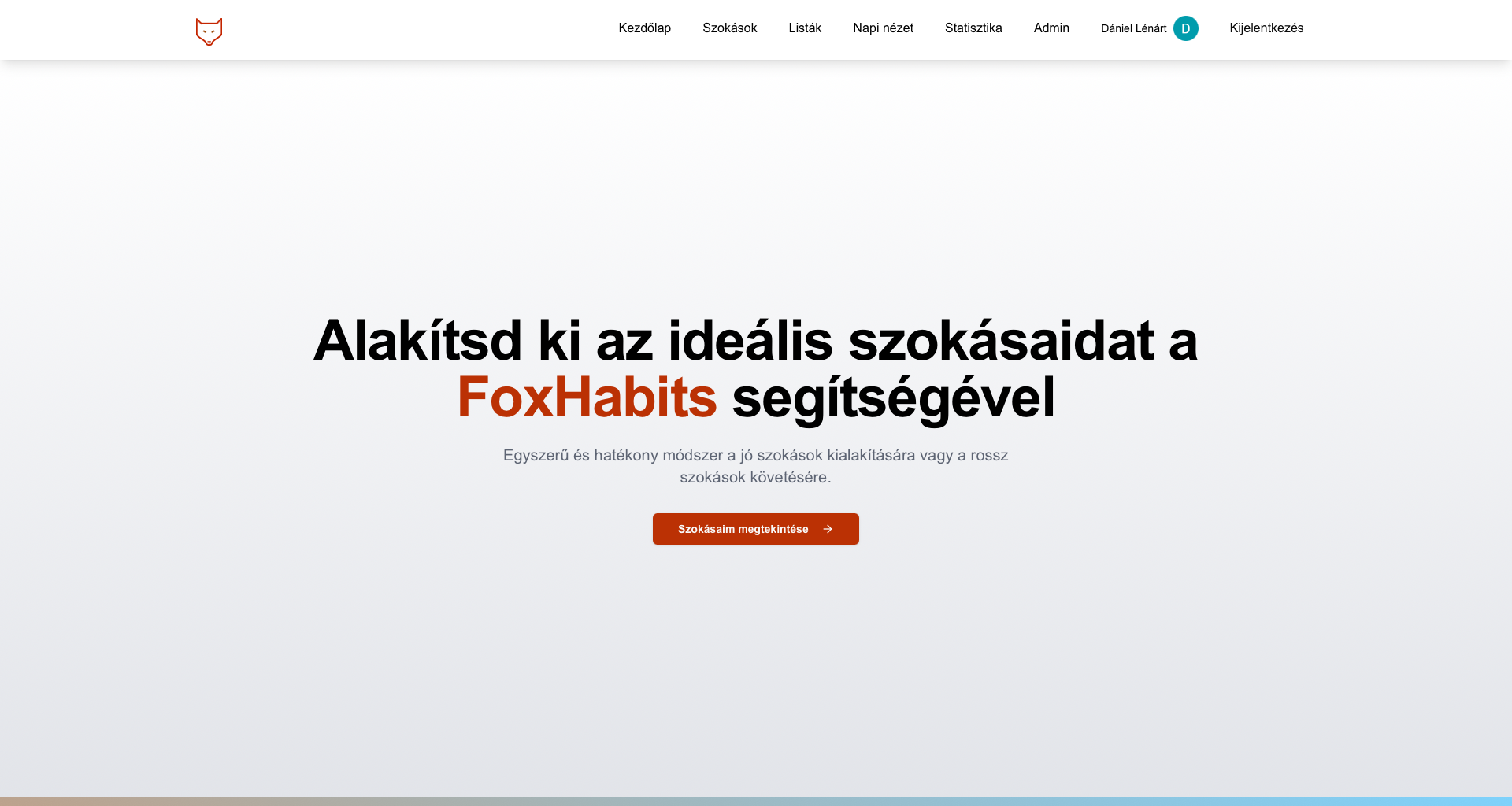 A FoxHabits egy szokásfigyelő app, amely segít a felhasználóknak nyomon követni a napi szokásaikat. Az alkalmazás célja, hogy motiválja a felhasználókat az egészséges életmódra és a céljaik elérésére. Komplex projekt backenddel, adatbázissal, authentikációval.